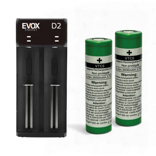 Les 2 batteries 18650 incluses fournissent une capacité réelle de 3000mAh à 3.7V, avec un courant de décharge max de 30A. Leur format standard (18.01 x 65.02 mm) garantit une compatibilité étendue avec la majorité des mods, box et autres appareils nécessitant de hautes performances, même en sub-ohm.